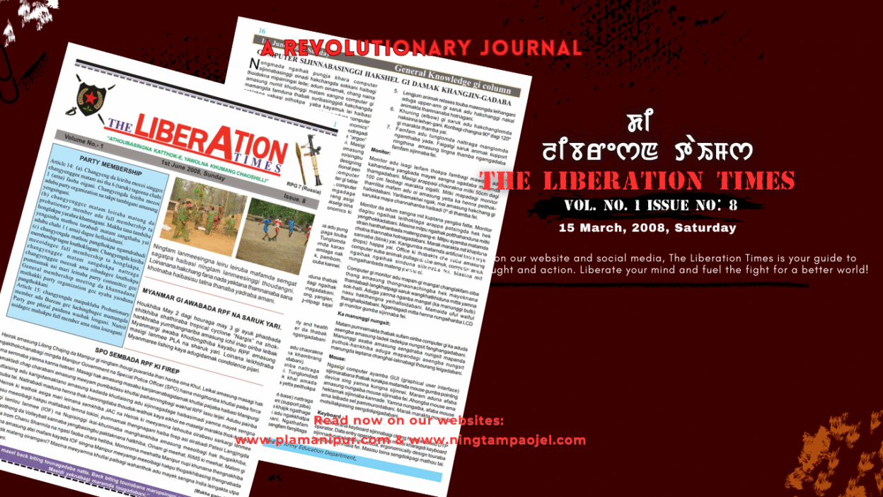 Latest Post Liberation Times Published onJune 1, 2008The Liberation Times Volume-1 Issue no.-8 Manunggi lamai da yaoribasing: PARTY MEMBERSHIP Article 14: (a). Changyeng da leiriba meeoi singgee changyenggee matam asi tha…